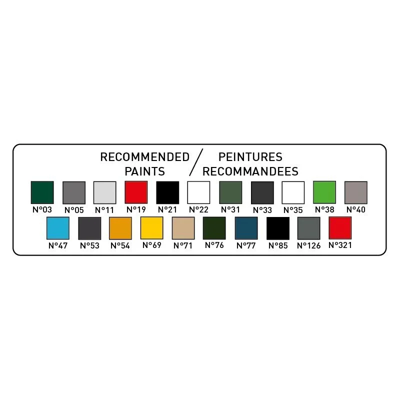 Humbrol : 3, 5, 11, 21, 22, 33, 40, 69, 71, 77, 85, 321