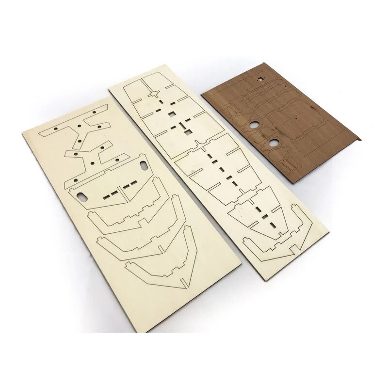 Prévu d’origine pour pouvoir être radiocommandé, la boîte contient toutes les pièces découpées au laser, les accastillages et le moteur électrique.